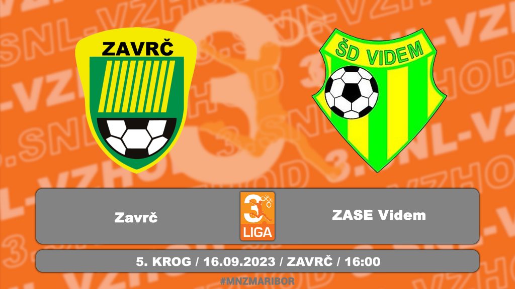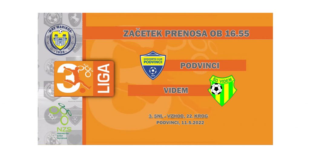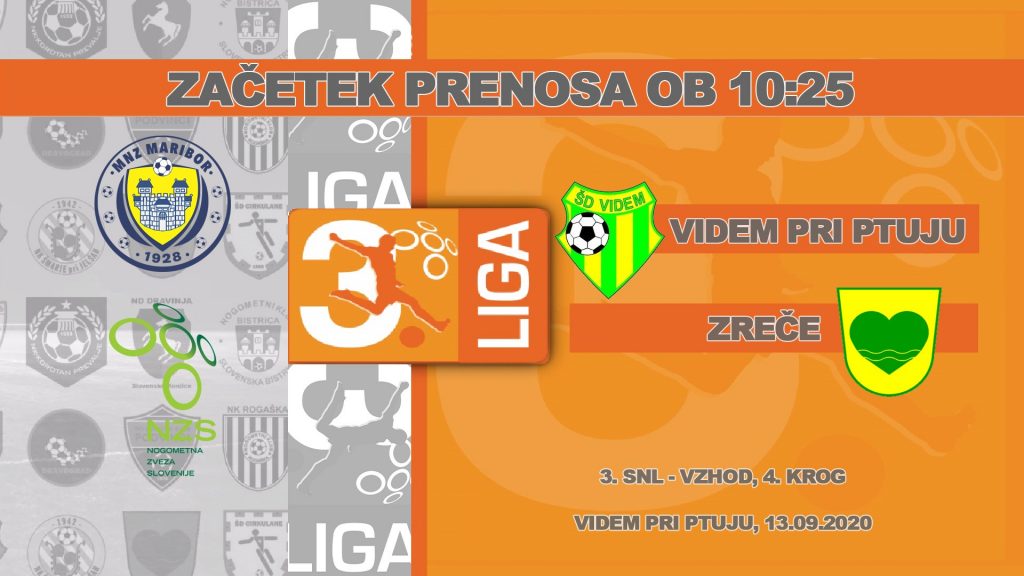 Tekma 4. kroga 3. SNL vzhod med ŠD Videm pri Ptuju in NK Zreče. Lestvica in rezultati 3. SNL-vzhod https://mnzmaribor.si/tekmovanje/3-snl-vzhod-20-21/