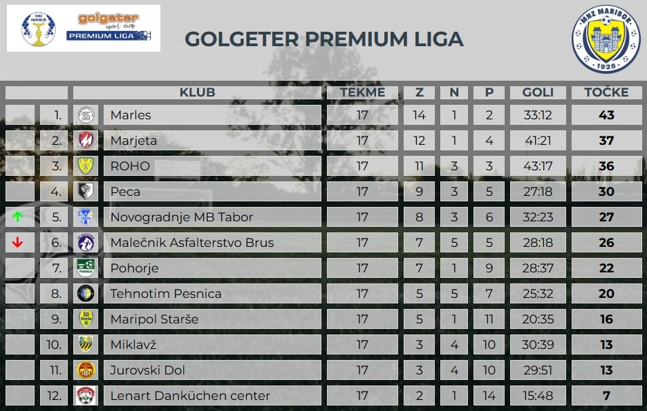 Vodilni trojček je z zmagami napovedal izredno zanimiv zaključni del prvenstva v Golgeter Premium Ligi MNZ Maribor. Vodilni limbuški Marles kot tudi Marjeta sta se po porazih v 16. krogu vrnila z zmago, ki ju še vedno drži pred ekipo ROHO, ki igra iz tekme v tekmo bolj samozavestno in nakazuje, da še ni konec borbe za prvaka! Izredno zanimivo je tudi v drugi polovici lestvice, kjer sta Jurovski Dol in Miklavž dala v višjo prestavo in prav zanimivo bo videti kjer se bosta ustavila. Ekipa Lenarta tako ostaja osamljena na zadnjem mestu in upa na morebitni čudež v zadnjih krogih.