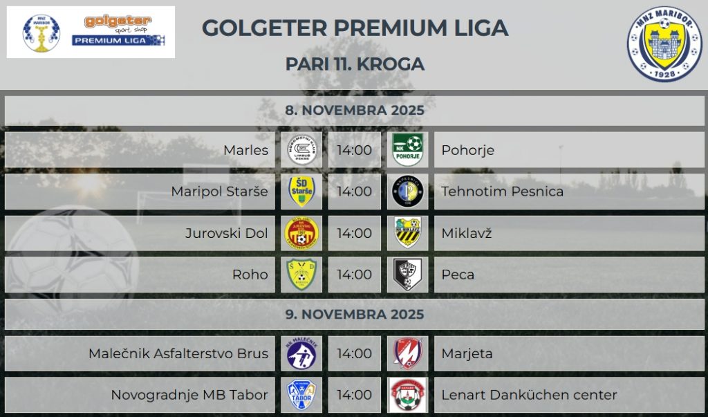 Pred nami je 11. krog Golgeter Premium lige, ki prinaša nove zanimive obračune. Na vrhu lestvice izenačeno vodita Marles in Marjeta s po 25 točkami, medtem ko jim sledijo Roho, Pohorje, Pesnica in Novogradnje MB Tabor. Jesenski del se bliža koncu, zato bodo točke zdaj še posebej dragocene. V vseh ekipah se zavedajo, da je potrebno narediti še piko na i v zadnji tekmi pred zimskim premorom, kjer se bodo ekipe zagotovo dodatno okrepile.