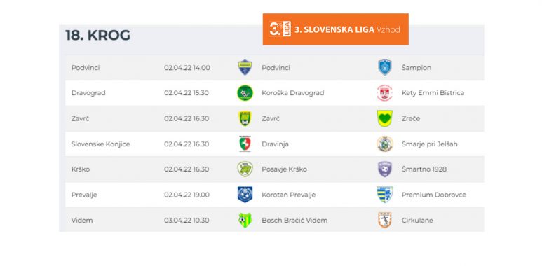 Pred nami je že 18. krog v 3. SNL – vzhod. Minuli konec tedna je bilo zelo zanimivo na vseh sedmih odigranih srečanjih. Tekmo zaostanka so v sredo odigrali tudi v Zrečah, kjer so se zmage veselili Podvinčani. Bistričani so na domačem igrišču le izvlekli remi proti ekipi iz Podvincev. Dobrovce so z zmago prekinile zmagovalni pohod Vidma, Dravinja je slavila v Celju pri Šampionu, Korotan pa prav tako suvereno v Šmarju pri Jelšah. Zreče so ponovno doživele domač poraz s Šmartnim, v Krškem se nadaljuje zmagovalna serija zmag, ki so tokrat premagali favorizirane Dravograjčane, haloški derbi ob polni tribuni med Cirkulanami in Zavrčem pa se je končal z delitvijo točk.