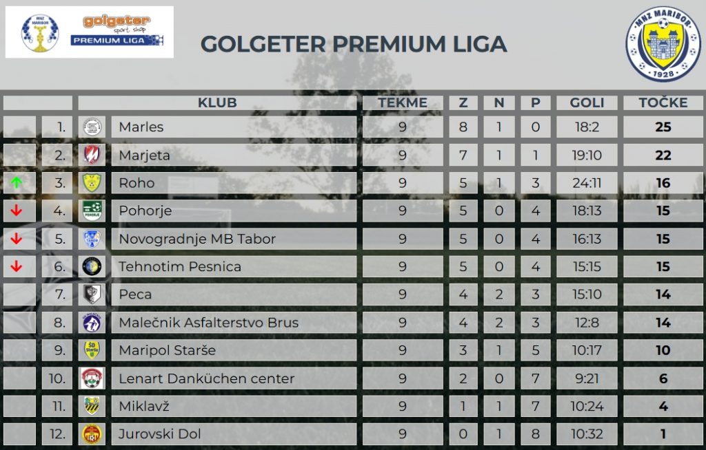 Končan je 9. kroga Golgeter Premium Lige MNZ Maribor. Ekipa ROHO je malce presenetljivo visoko slavila pri mariborskem Taboru. Marjeta je na domačem terenu pokazala svoj pravi karakter in ugnala Rušane. Marles iz Limbuša brezkompromisno nabira točke. Tokrat so Limbušani premagali Pesničane na domačem terenu. Malečnik je na domačem terenu v zanimivi tekmi premagal Miklavž in naredil pomemben korak v sredino lestvice. Starše so ponovno dokazale, da lahko zmagajo pred domačo publiko. Danes so bili boljši od direktnih konkurentov iz Lenarta. Jurovski Dol pa je moral priznati poraz ekipi iz Črne na Koroškem.