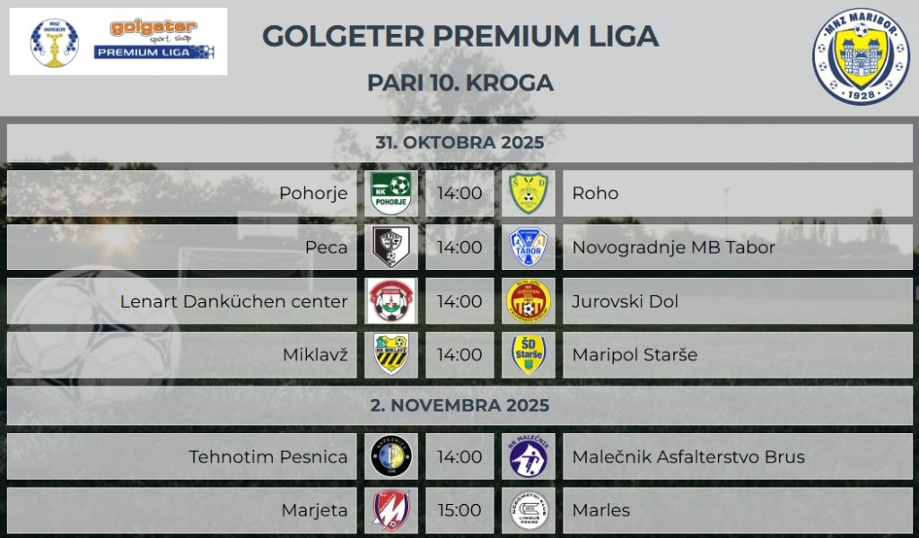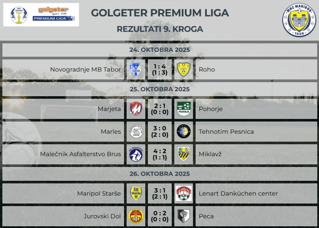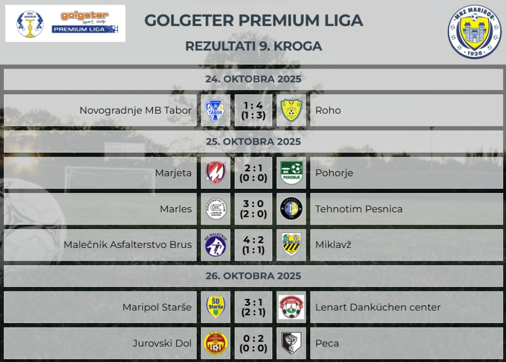 Končan je 9. kroga Golgeter Premium Lige MNZ Maribor. Ekipa ROHO je malce presenetljivo visoko slavila pri mariborskem Taboru. Marjeta je na domačem terenu pokazala svoj pravi karakter in ugnala Rušane. Marles iz Limbuša brezkompromisno nabira točke. Tokrat so Limbušani premagali Pesničane na domačem terenu. Malečnik je na domačem terenu v zanimivi tekmi premagal Miklavž in naredil pomemben korak v sredino lestvice. Starše so ponovno dokazale, da lahko zmagajo pred domačo publiko. Danes so bili boljši od direktnih konkurentov iz Lenarta. Jurovski Dol pa je moral priznati poraz ekipi iz Črne na Koroškem.